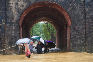 Người dân vượt qua cổng thành cổ giữa dòng nước lũ – biểu tượng kiên cường của miền di sản Huế.
